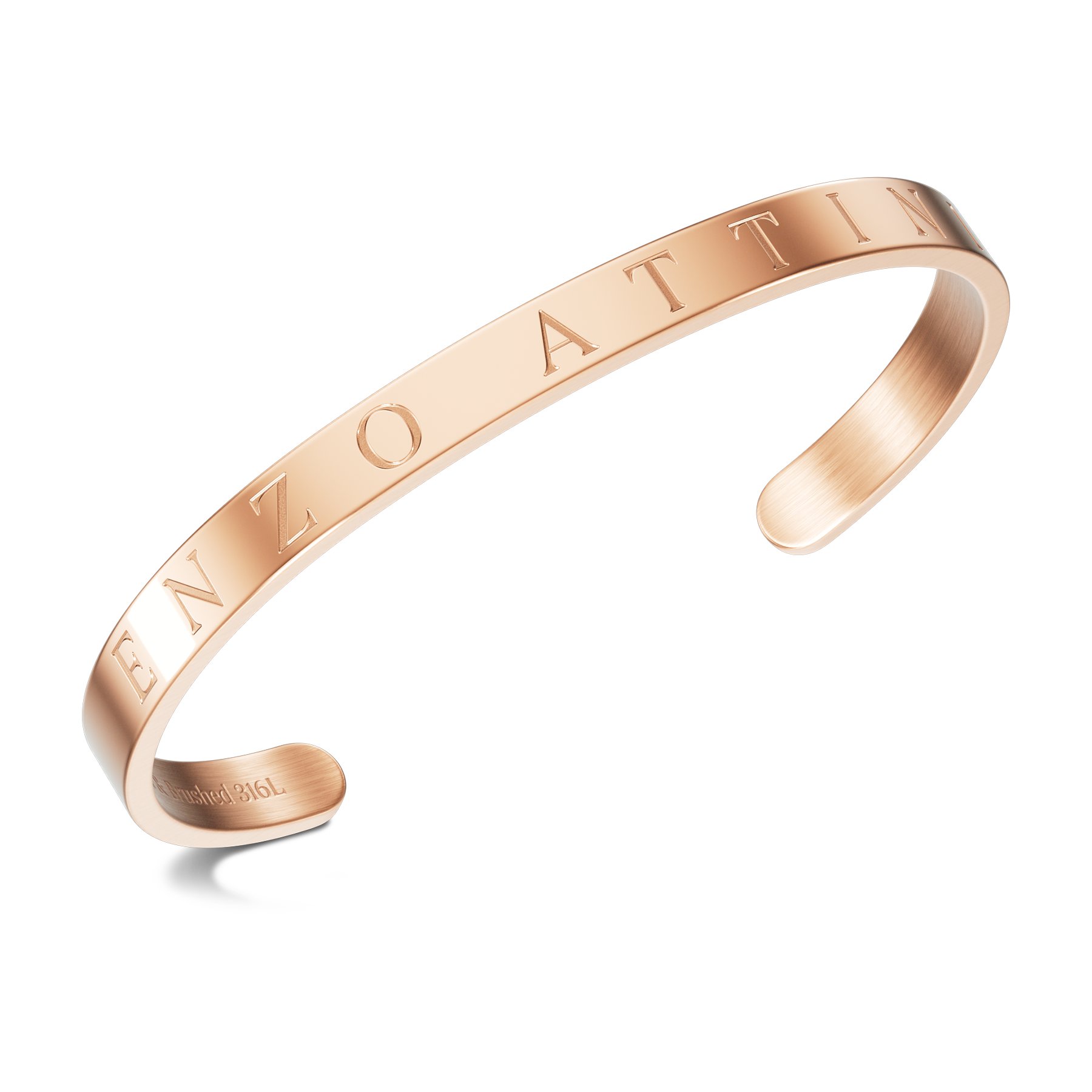 SPECIFICATIONS • Material: 316L stainless steel, rose gold color (plated with real 18K gold) • Available sizes (inner dimensions): M: 42 mm × 57 mm × 155 mm L: 46 mm × 63 mm × 175 mm XL: 51 mm × 70 mm × 195 mm • Customization: Complimentary engraving available upon request • Packaging: Comes in premium packaging, perfect for gifting • Warranty: 6-month international warranty