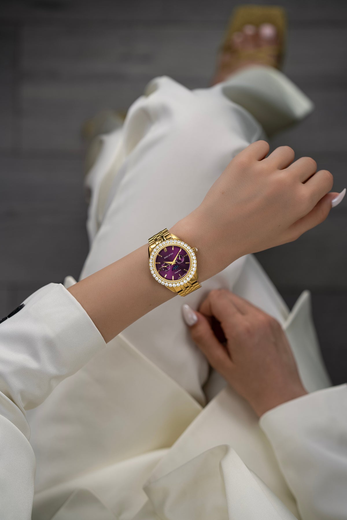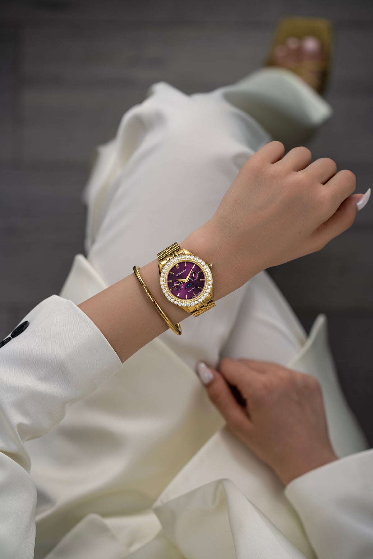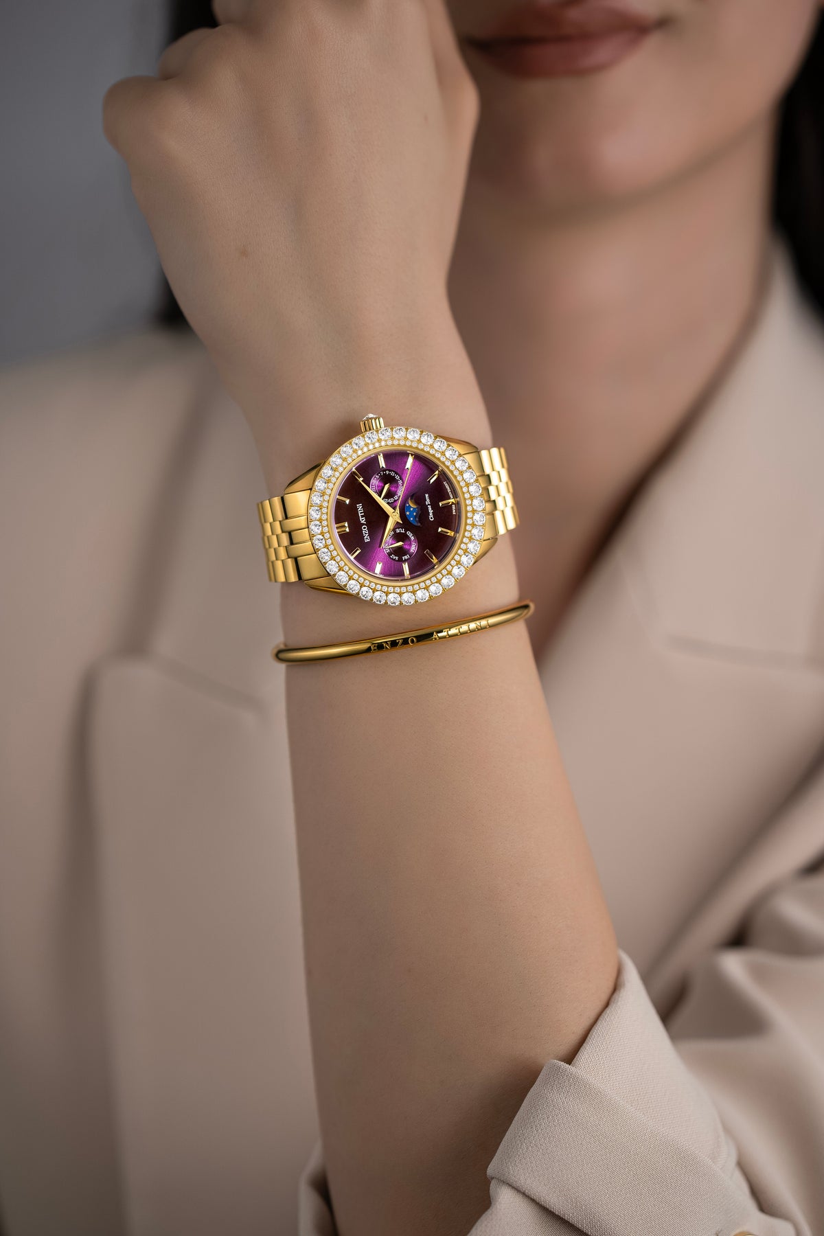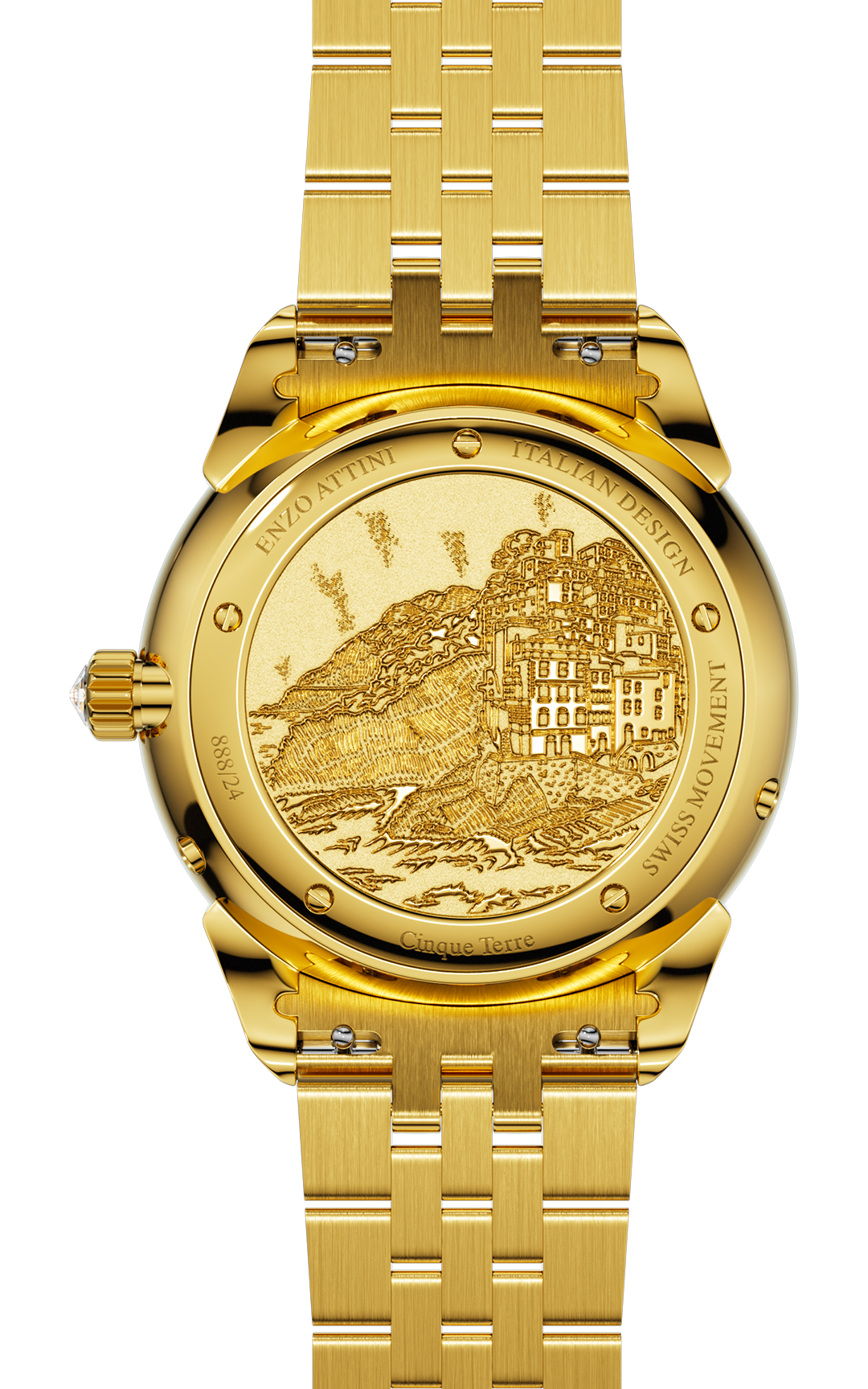 SPECIFICATIONS • Case: Stainless steel 316L, gold color (plated with genuine 18K gold), 40mm x 8.9mm. • Crystal: Sapphire glass with anti-reflective treatment. • Dial: Copper, hand-applied polished markers. • Movement: Swiss-made quartz, 5 jewels. • Functions: Hours, minutes and seconds. • Water Resistance: Up to 5 ATM. •President Bracelet: Stainless steel 316L, gold color (plated with genuine 18K gold), fits wrists up to 22 cm. • Box: Certificate of Authenticity with unique serial number. Premium packaging. Box dimensions: 205 x 145 x 120mm.