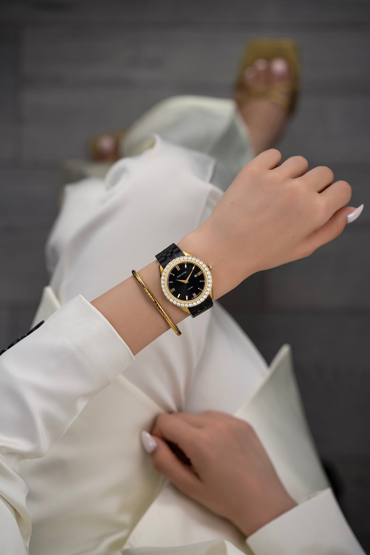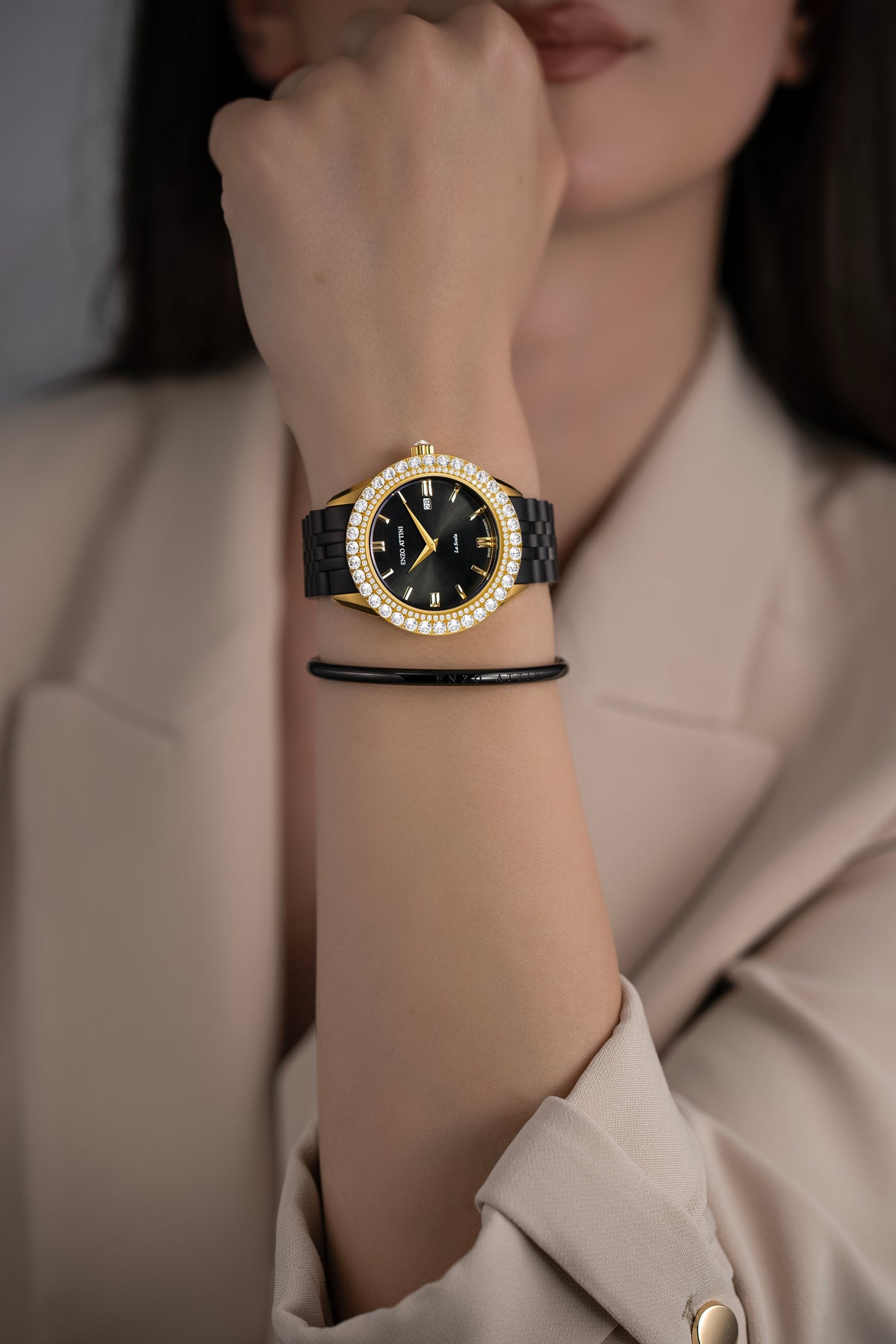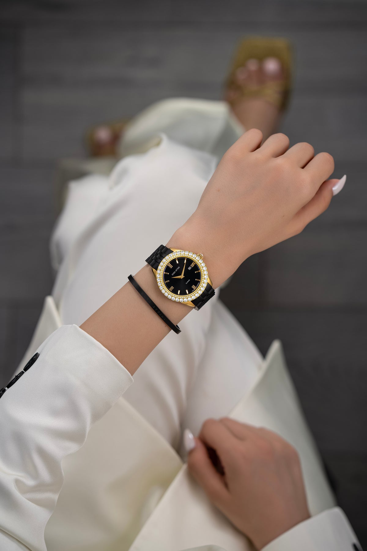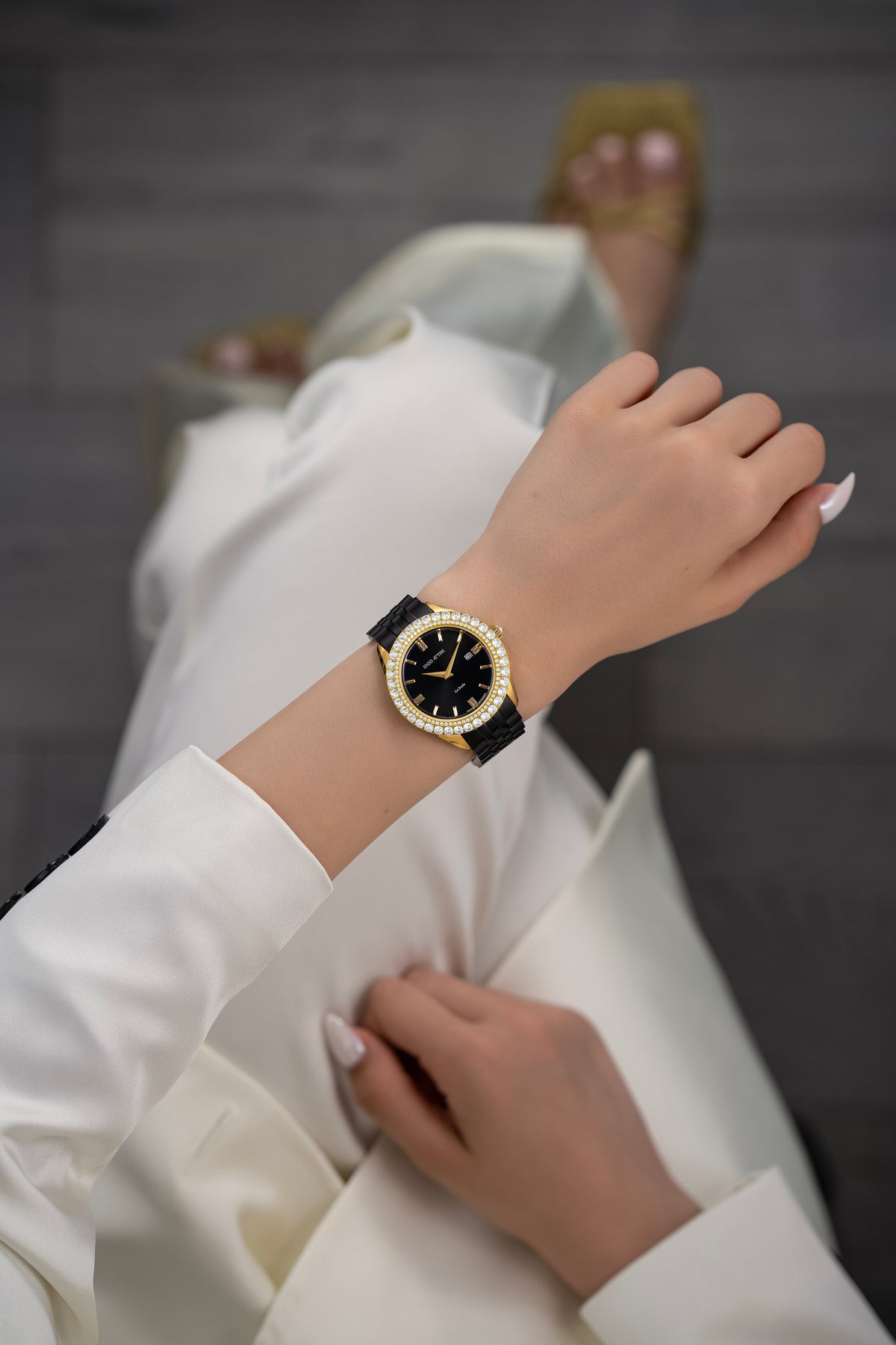 SPECIFICATIONS • Case: Stainless steel 316L, gold color (plated with genuine 18K gold), 40mm x 8.9mm. • Crystal: Sapphire glass with anti-reflective treatment. • Dial: Copper, hand-applied polished markers. • Movement: Swiss-made quartz, 5 jewels. • Functions: Hours, minutes and date. • Water Resistance: Up to 5 ATM. •President Bracelet: Stainless steel 316L, black color, fits wrists up to 22 cm. • Box: Certificate of Authenticity with unique serial number. Premium packaging. Box dimensions: 205 x 145 x 120mm.