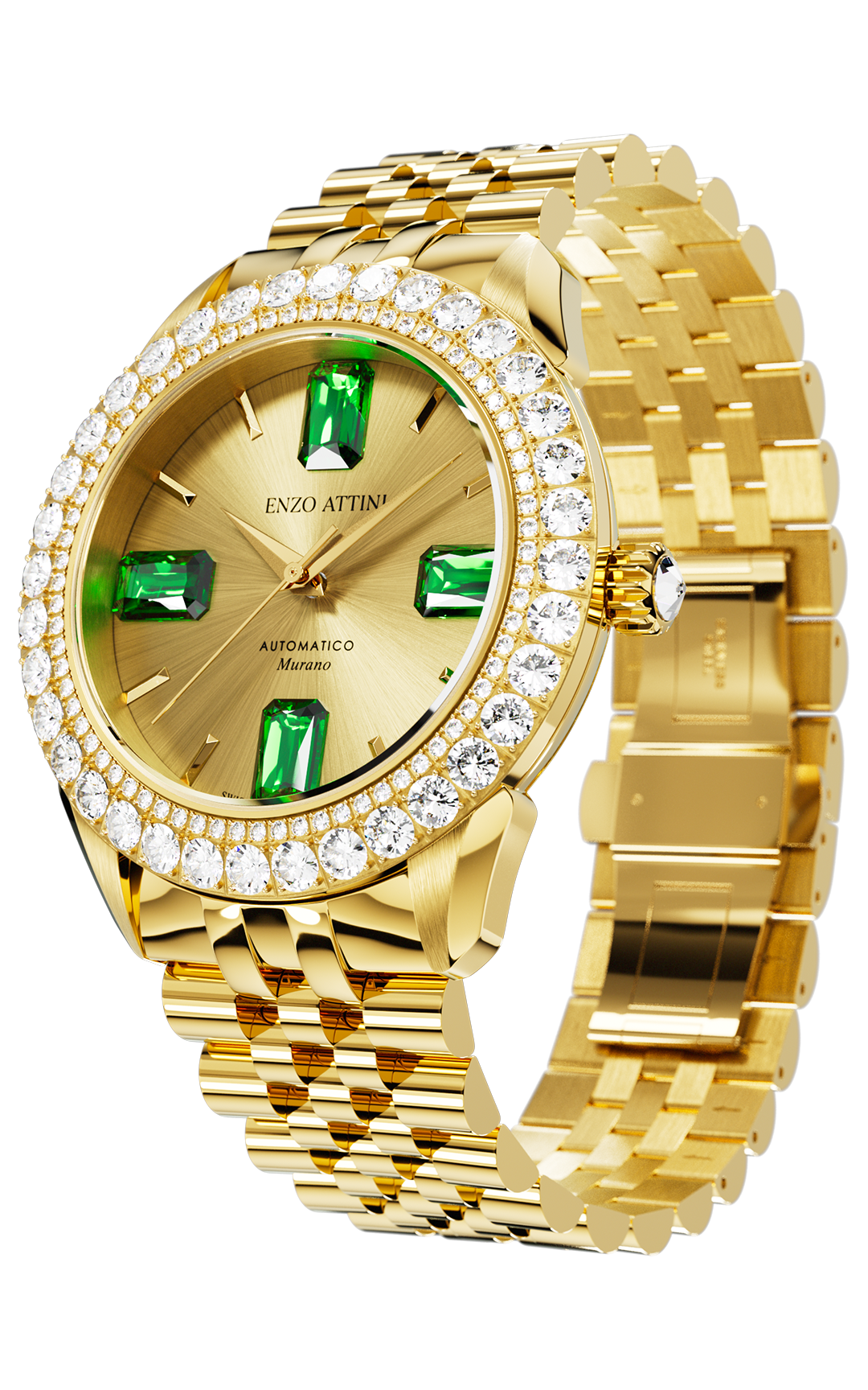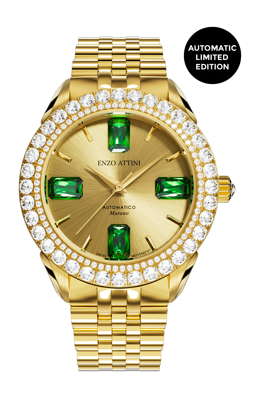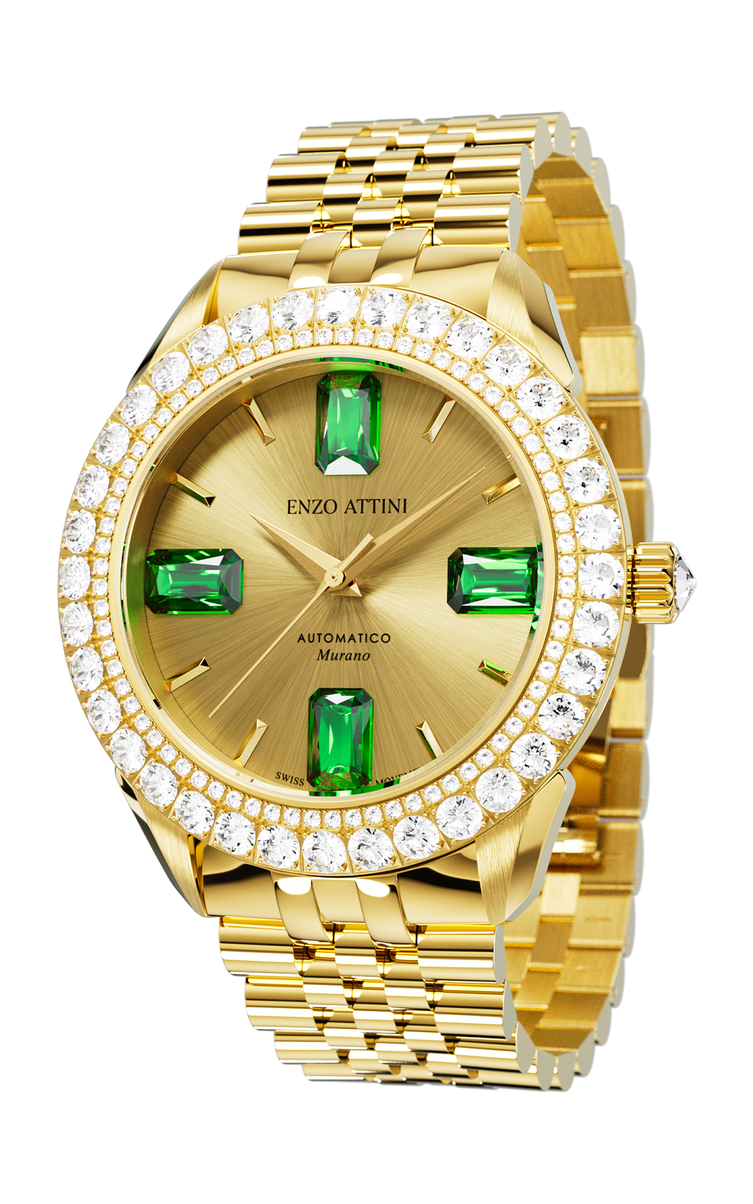 GEMS • Bezel: 72 small white zirconia & 36 big white zirconia • Dial: 4 emeralds, 0.49 Ct each • Crown: 1 white zirconia