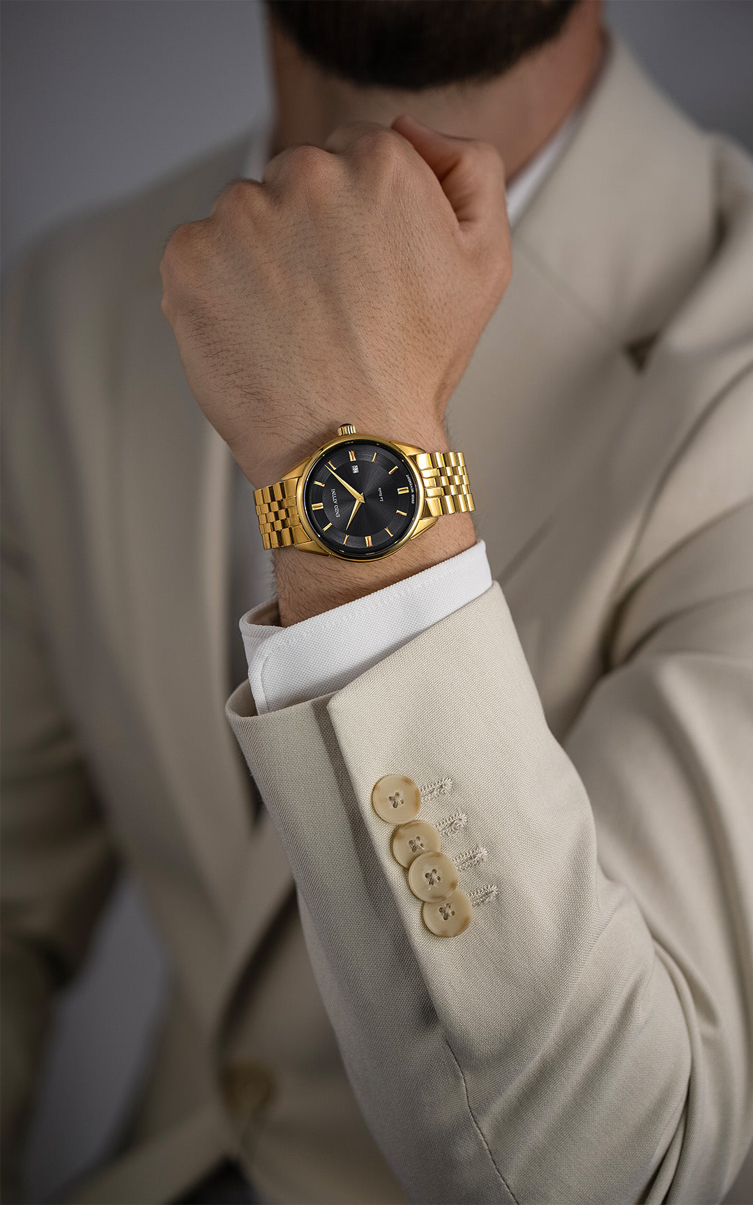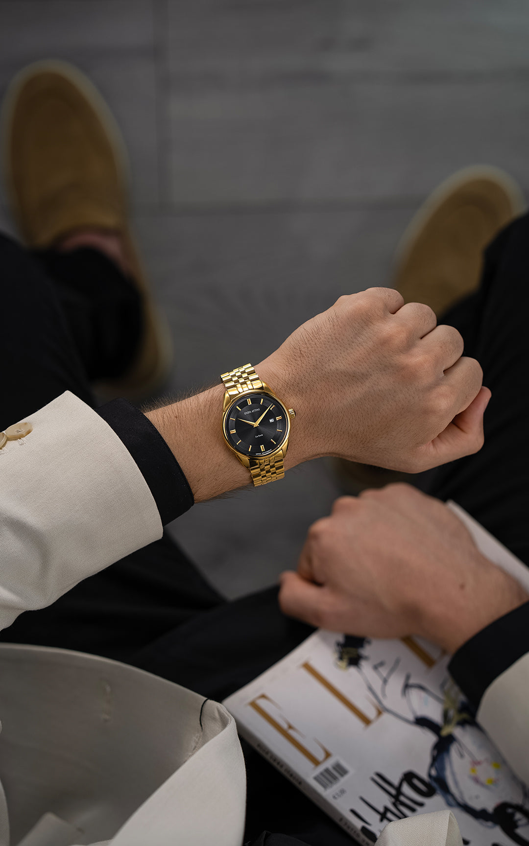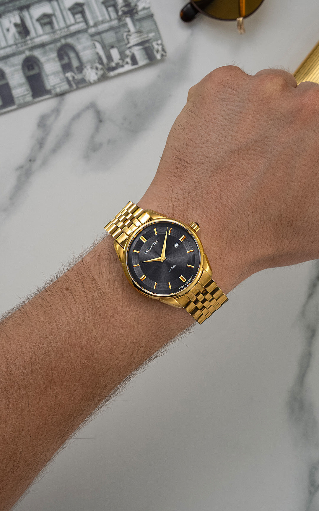 President Bracelet: Stainless steel 316L, gold color (plated with genuine 18K gold), fits wrists up to 22 cm.