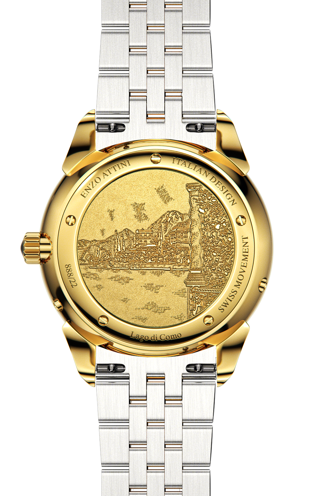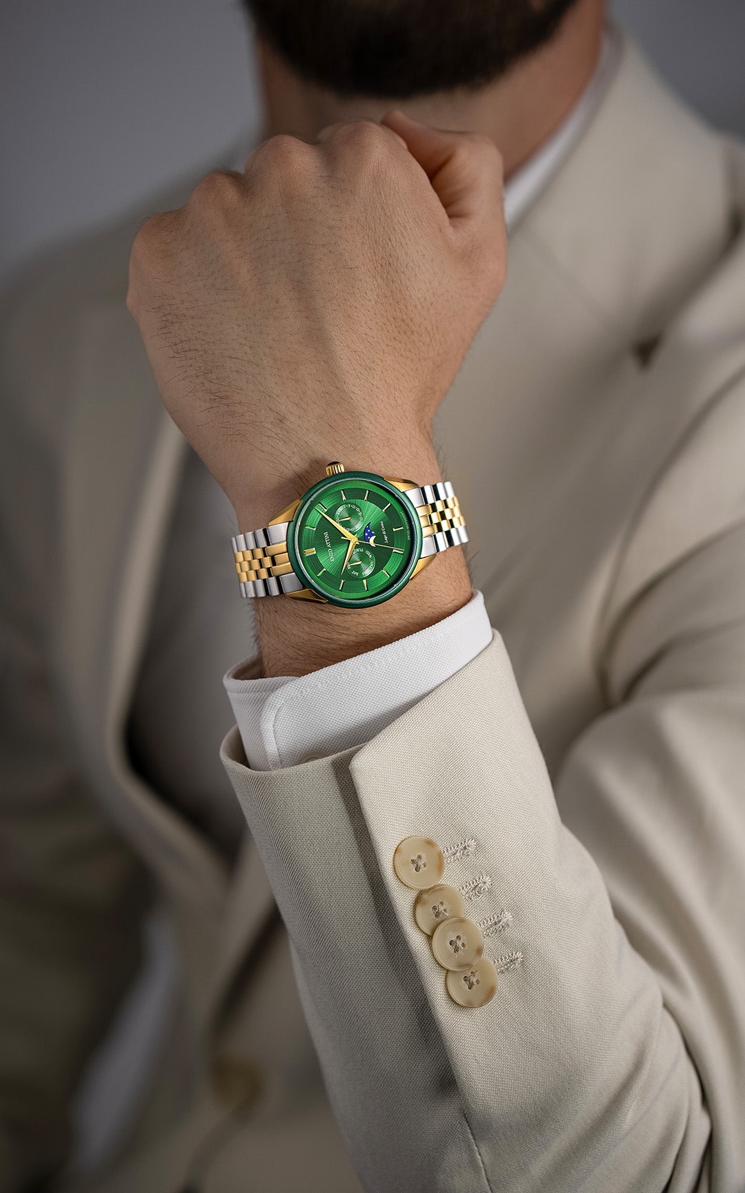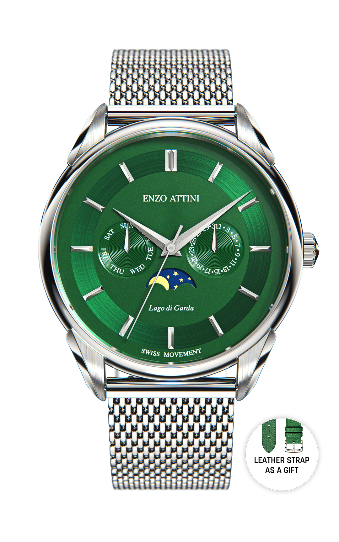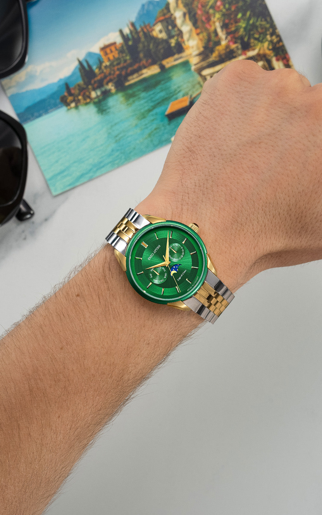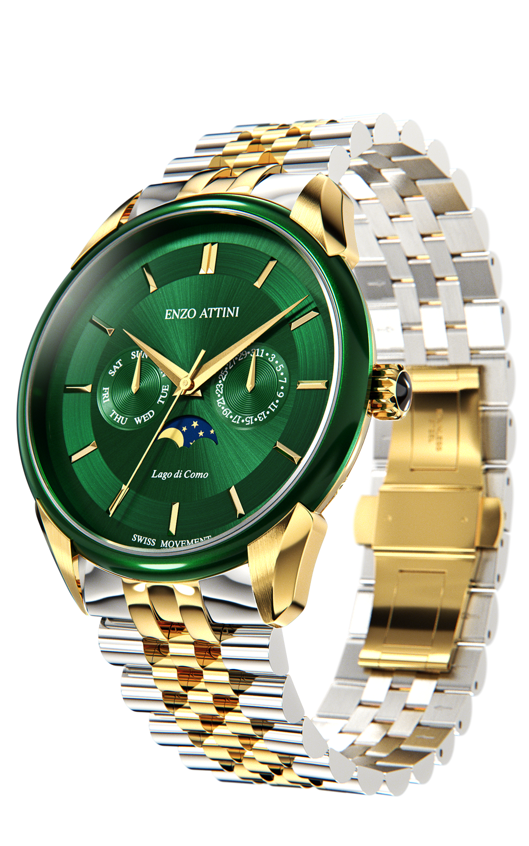SPECIFICATIONS • Case: Stainless steel 316L, green & gold color (plated with genuine 18K gold), 40mm x 8.9mm. • Crystal: Sapphire glass with anti-reflective treatment. • Dial: Copper, hand-applied polished markers. • Movement: Swiss-made quartz, 5 jewels. • Functions: Hours, minutes, date, month and moonphase at 6 o’clock. • Water Resistance: 5 ATM. • President Bracelet: Stainless steel 316L, silver & gold color (plated with genuine 18K gold), fits wrists up to 22 cm. • Box: Certificate of Authenticity with unique serial number. Premium packaging. Box dimensions: 115 x 115 x 95mm. • Warranty: 2-year international warranty.