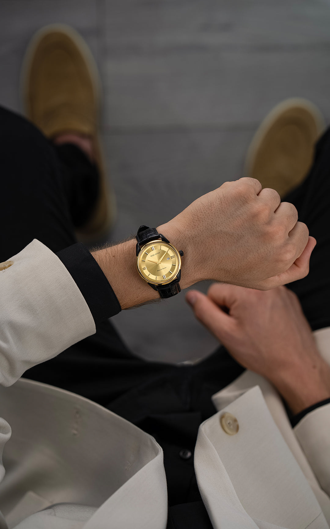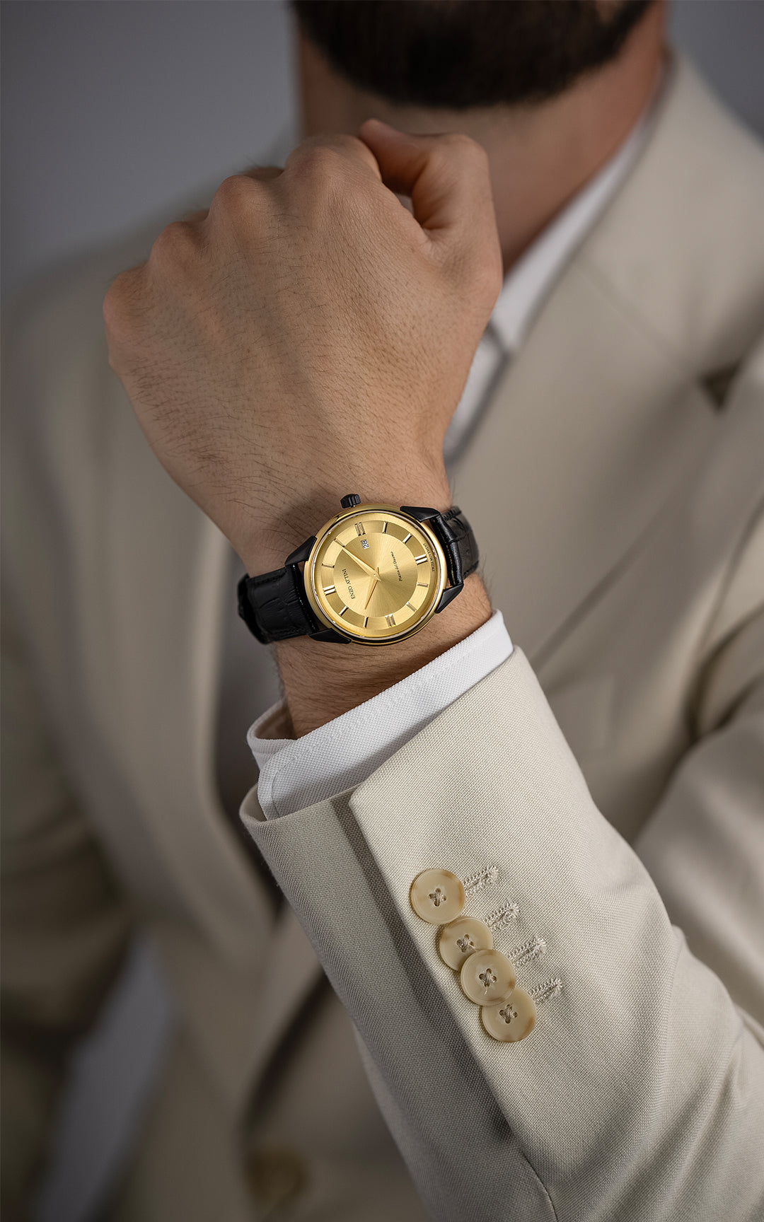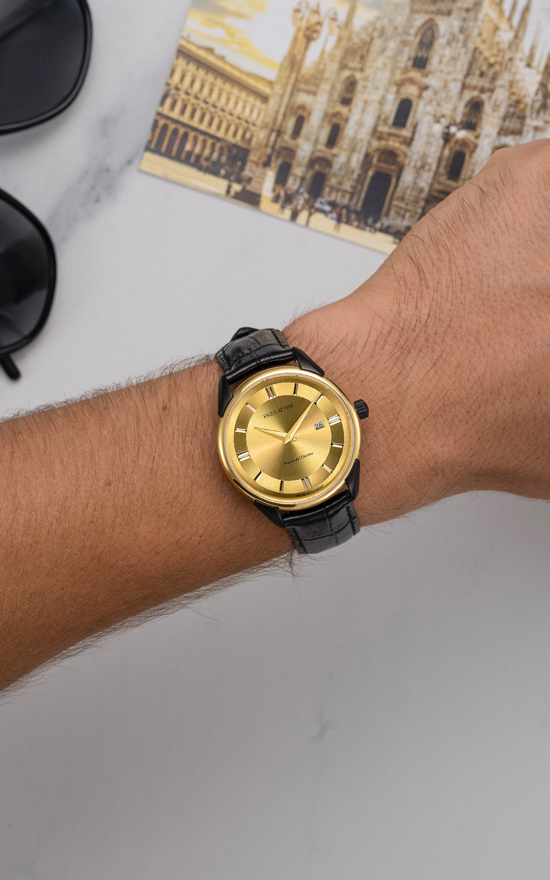 SPECIFICATIONS • Case: Stainless steel 316L, black & gold color (plated with genuine 18K gold), 40mm x 8.9mm. • Crystal: Sapphire glass with anti-reflective treatment. • Dial: Copper, hand-applied polished markers. • Movement: Swiss-made quartz, 5 jewels. • Functions: Hours, minutes and date. • Water Resistance: 5 ATM. • Strap: Italian leather strap (croc pattern), black color, 20mm x 18mm, adjustable to fit wrists from 14 to 23cm. • Inside the Box: Certificate of Authenticity with a unique serial number. Premium packaging. Box dimensions: 115 x 115 x 95mm. • Warranty: 2-year international warranty.