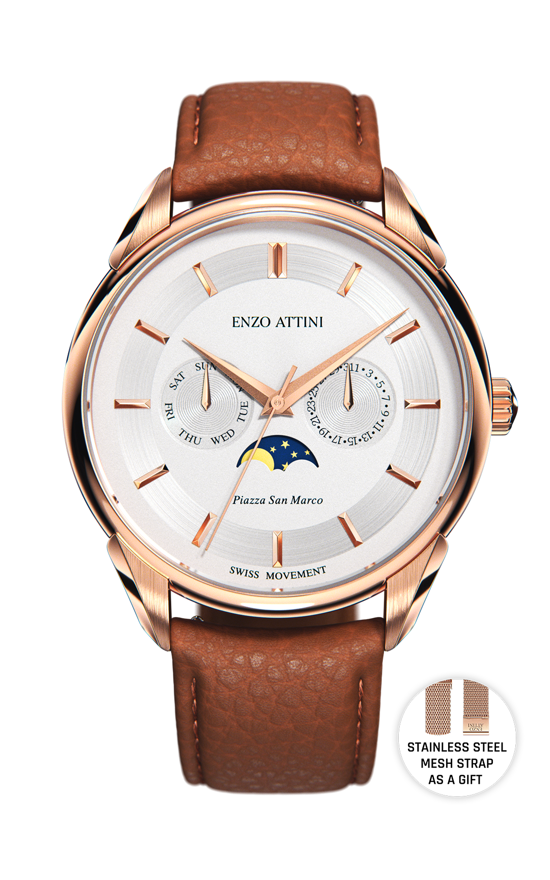 SPECIFICATIONS • Case: Stainless steel 316L, silver color, 40mm x 8.9mm. • Crystal: Sapphire glass with anti-reflective treatment. • Dial: Copper, hand-applied polished markers. • Movement: Swiss-made quartz, 5 jewels. • Functions: Hours, minutes, date, month and moonphase at 6 o’clock. • Water Resistance: 5 ATM. • Straps: The watch comes with italian leather strap already in place, black color, 20mm x 18mm, ideal for 14-23cm wrists. Gift, a mesh strap, stainless steel 316L, silver color, adjustable size - fits all wrists, placed inside the drawer compartment of the box. • Inside the Box: The watch, gift strap and Certificate of Authenticity with a unique serial number. Premium packaging. Box dimensions: 115 x 115 x 95mm. • Warranty: 2-year international warranty.