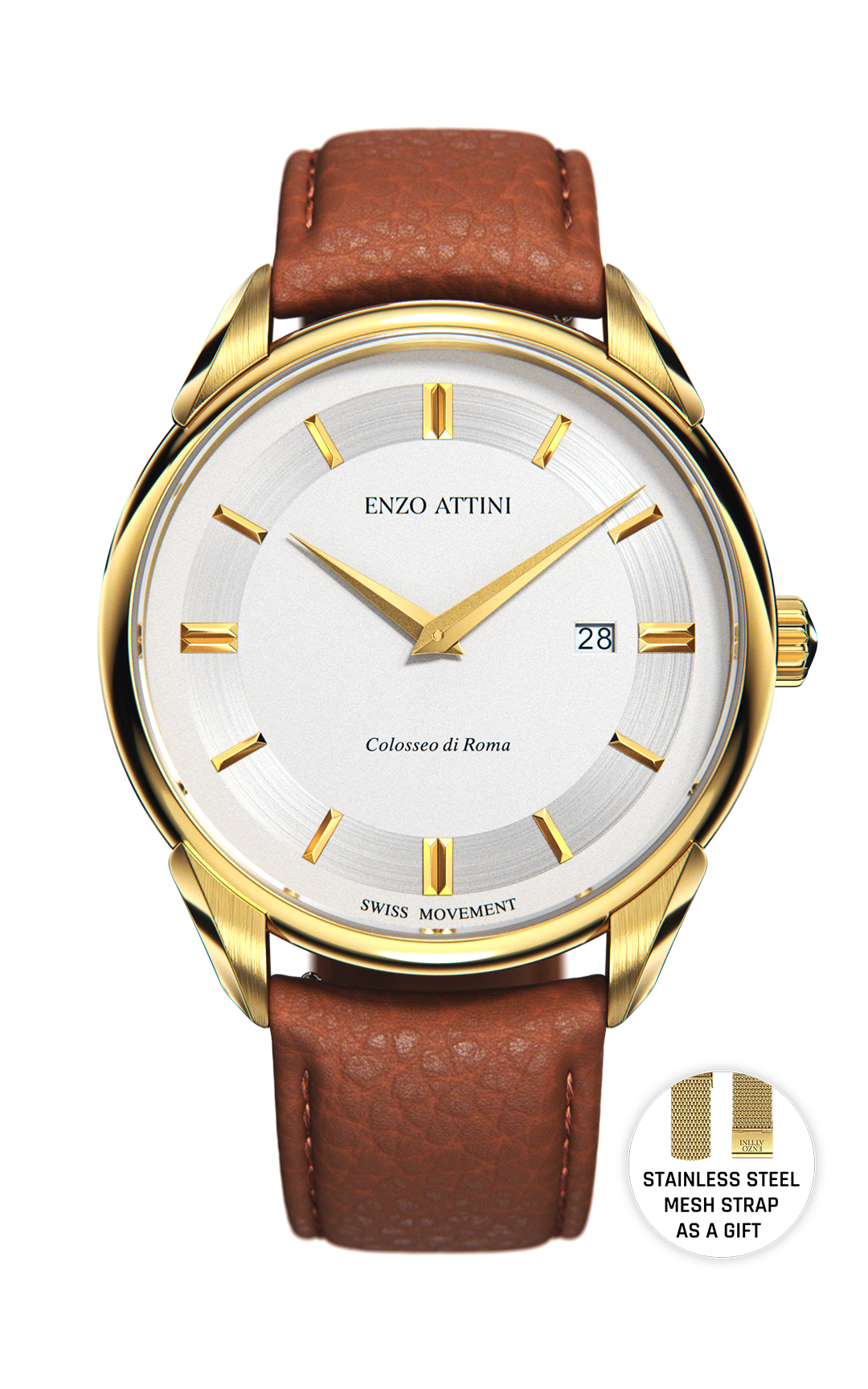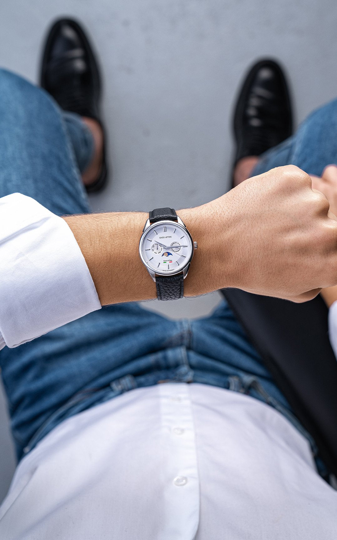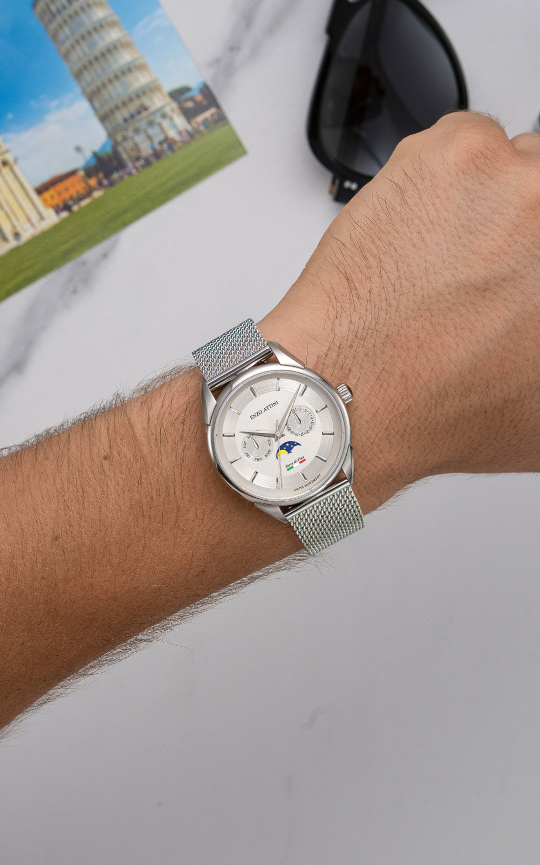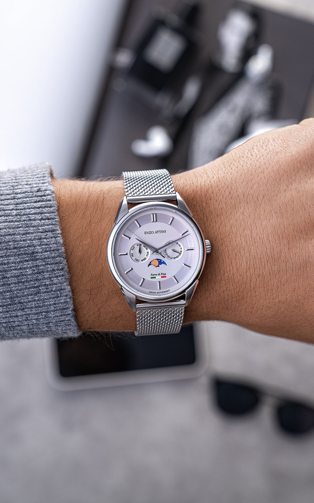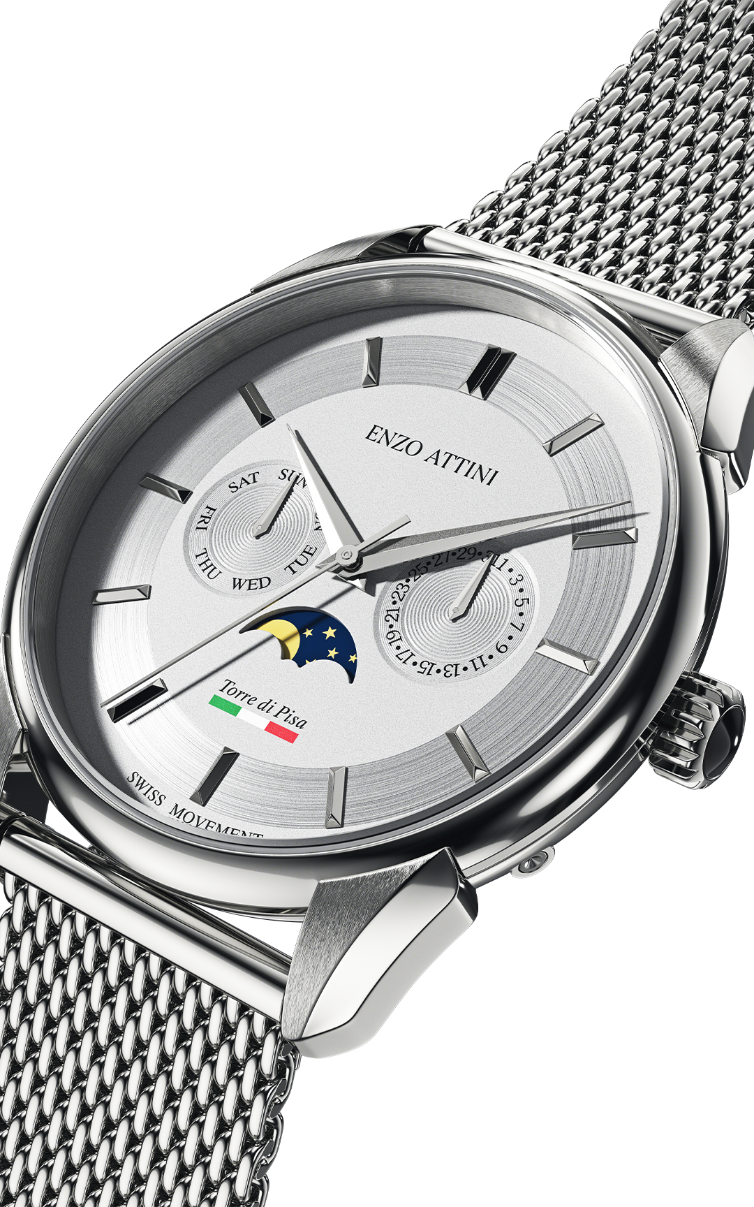 SPECIFICATIONS • Case: Stainless steel 316L, silver color, 40mm x 8.9mm. • Crystal: Sapphire glass with anti-reflective treatment. • Dial: Copper, hand-applied polished markers. • Movement: Swiss-made quartz, 5 jewels. • Functions: Hours, minutes, date, month and moonphase at 6 o’clock. • Water Resistance: 5 ATM. • Straps: The watch comes with a mesh strap already in place, stainless steel 316L, silver color, adjustable size - fits all wrists. Gift strap in italian leather, black color, 20mm x 18mm, ideal for 14-23cm wrists, placed inside the drawer compartment of the box. • Inside the Box: The watch, gift strap and Certificate of Authenticity with a uniqueserial number. Premium packaging. Box dimensions: 115 x 115 x 95mm. • Warranty: 2-year international warranty.