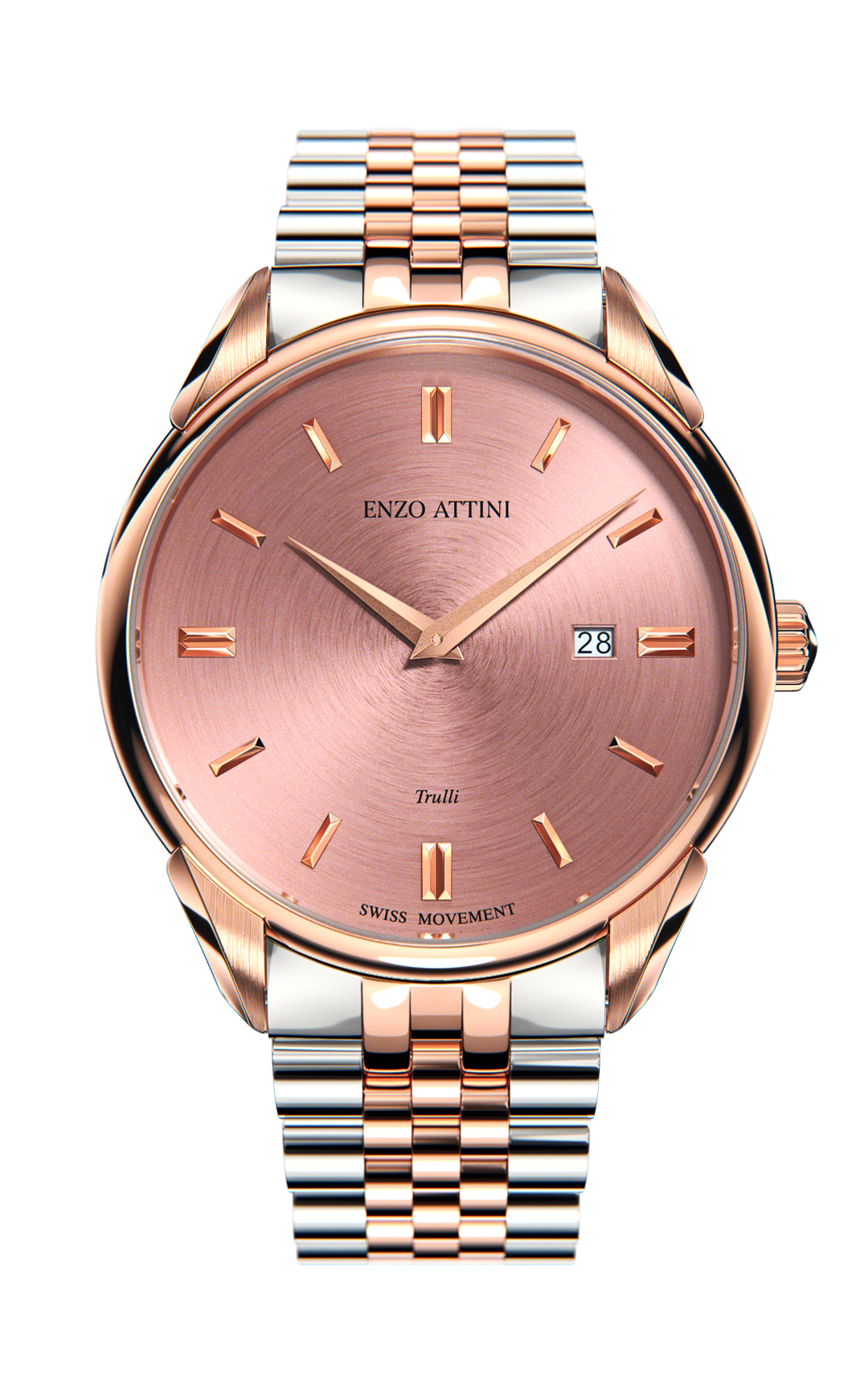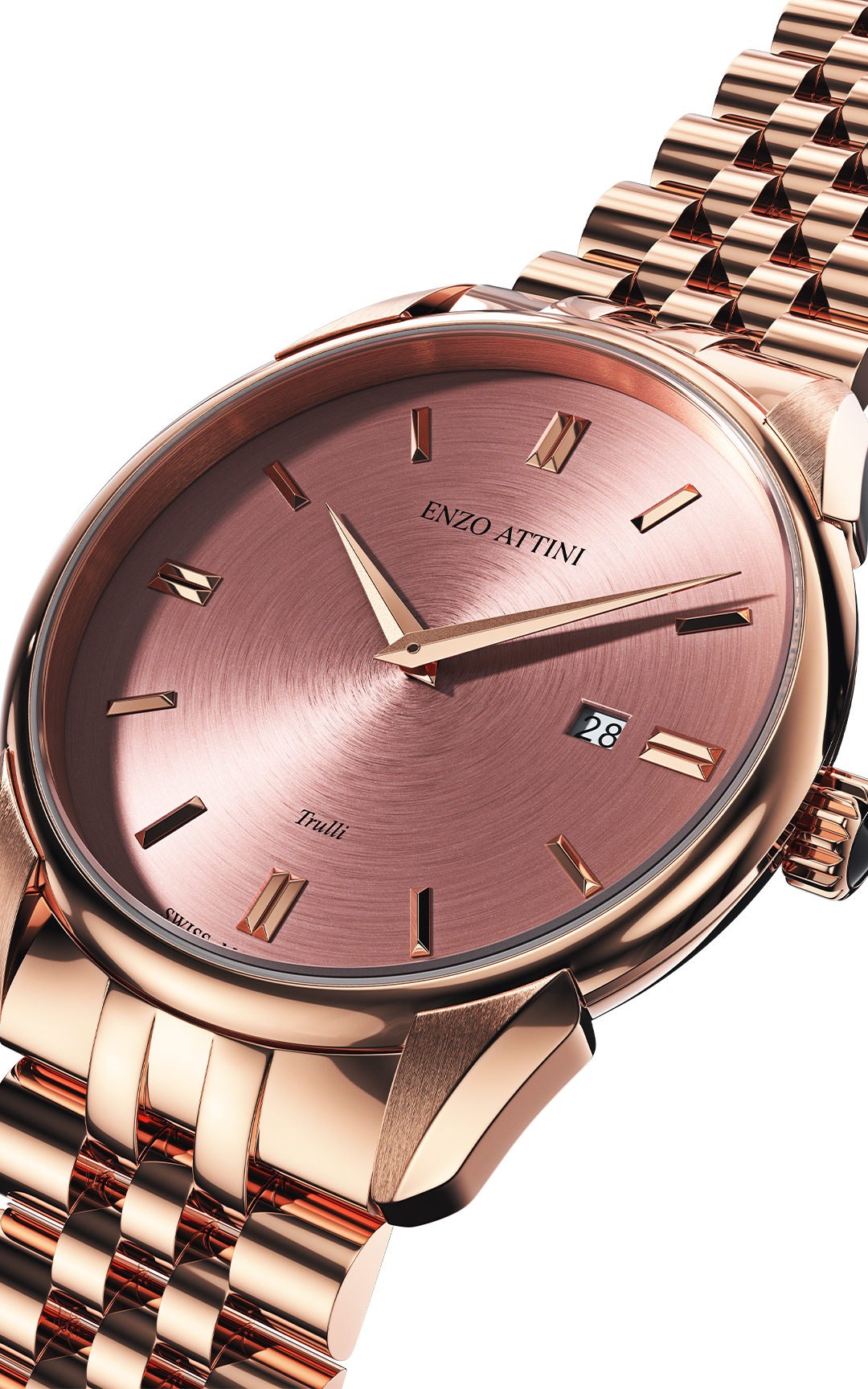 Case: Stainless steel 316L, rose gold color (plated with genuine 18K gold), 40mm x 8.9mm.