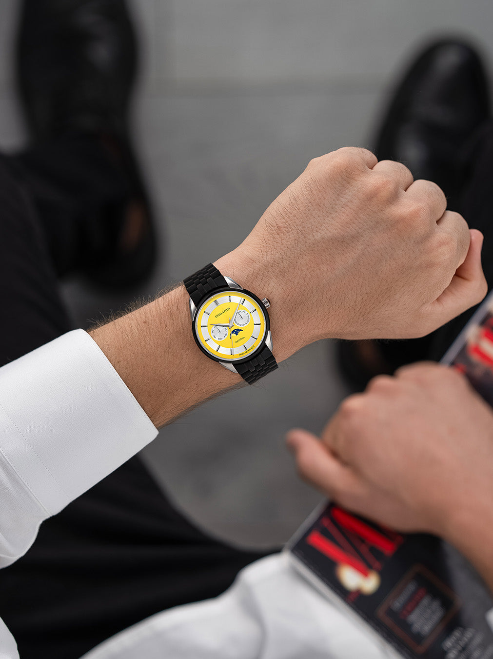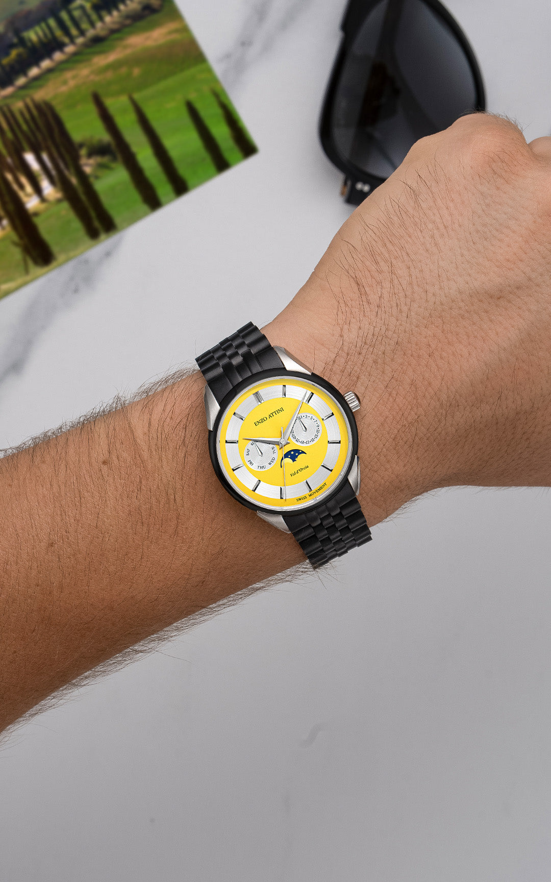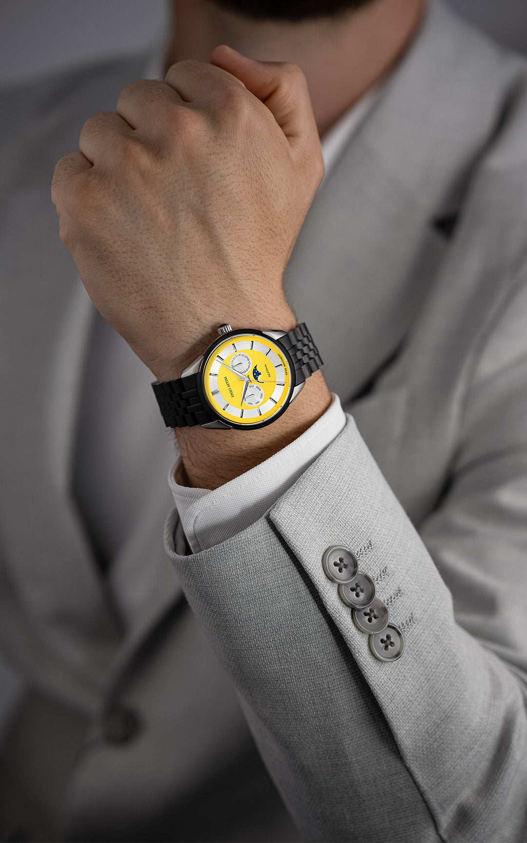 SPECIFICATIONS • Case: Stainless steel 316L, black & silver color, 40mm x 8.9mm. • Crystal: Sapphire glass with anti-reflective treatment. • Dial: Copper, hand-applied polished markers. • Movement: Swiss-made quartz, 5 jewels. • Functions: Hours, minutes, date, month and moonphase at 6 o’clock. • Water Resistance: 5 ATM. • President Bracelet: Stainless steel 316L, black color, fits wrists up to 22 cm. • Box: Certificate of Authenticity with unique serial number. Premium packaging. Box dimensions: 115 x 115 x 95mm. • Warranty: 2-year international warranty.